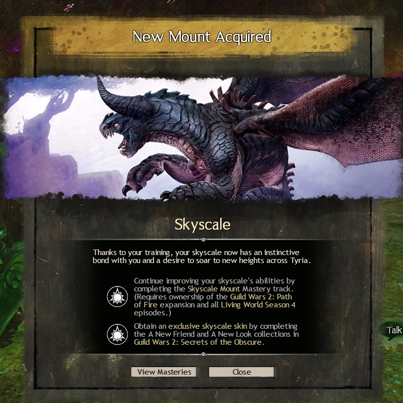 I never bothered with the skyscale, even after they added the faster quest. I absolutely adore gliding in GW2 and I never felt the lack of a flight option until they started fixing the content to all-but require one. That royally pissed me off but fortunately it co-incided with my departure from the game for largely unrelated reasons so it didn’t matter much in the end.