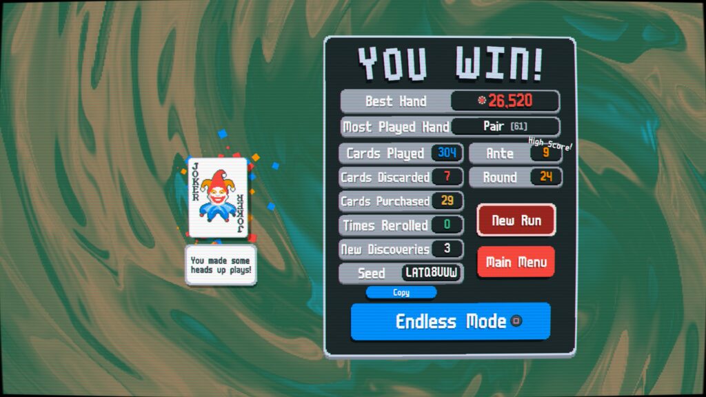 During my playthrough, I had to stop myself from accidentally making any hand but a pair, because by the end, even a royal flush would have been a downgrade. When a boss blind turned all the cards around, I just assumed the top five would have a pair. (I’d also leveled up High Card some). The last boss blind forced me to put a specific card in my hand. I’d play a pair — and that card. I was doing about 27,000 points per pair I played. I also had a Joker that took away all my discards but gave me three more hands, so my expected total point value at that point was 7 x 27,000 = 189,000 points — well above the 120,000 points I needed to win the game. You can continue after that, but my strategy had pretty much reached its limit, and I wasn’t going to be able to beat the next boss at 220,000 points.
