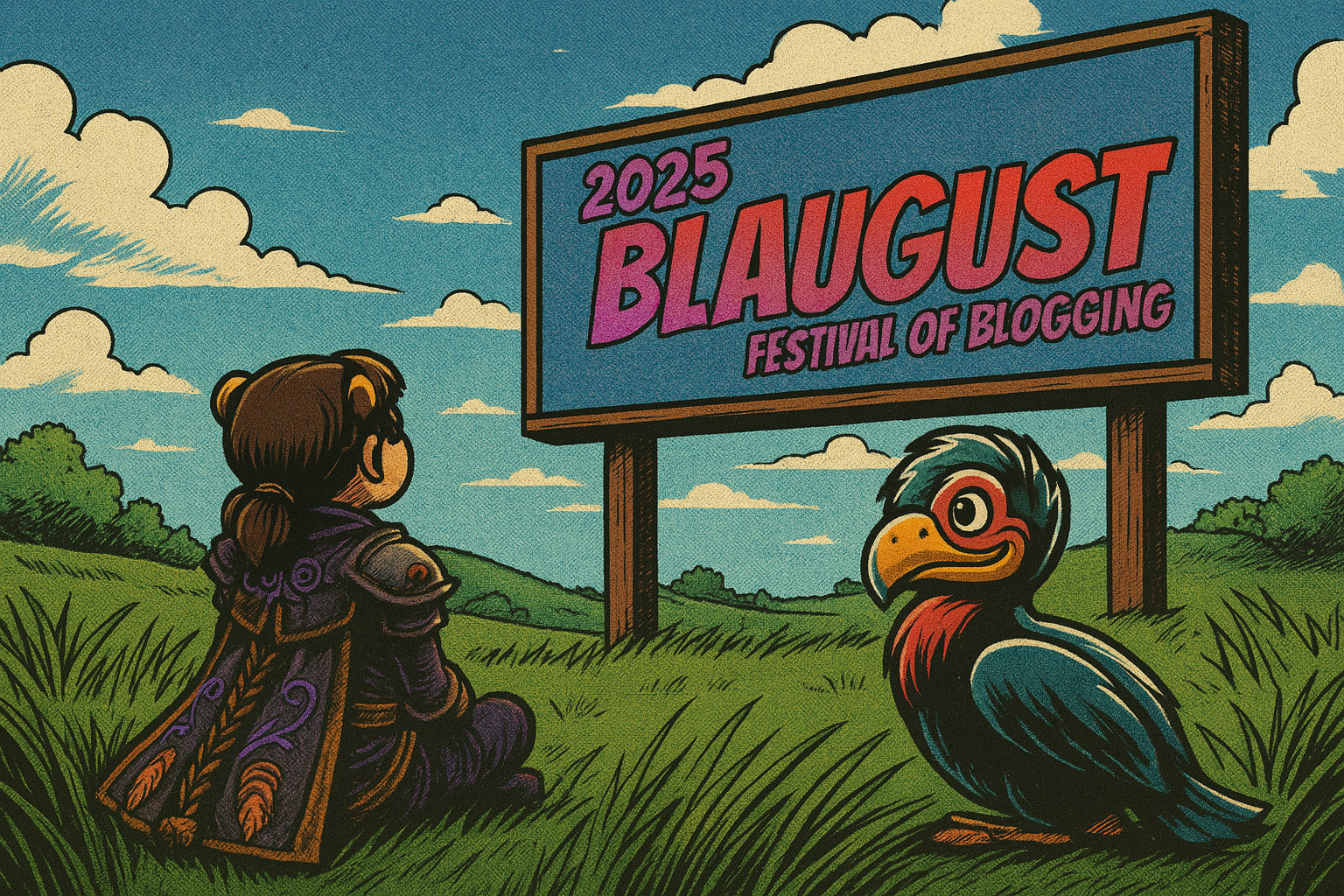 I got into EverQuest 2 and took a bunch of screenshots of my halfling bard, Tipa, there. She’s the most pure expression of Tipa-ness I’ve found in an MMO. I uploaded those and the Blaugust 2025 banner to ChatGPT and told it generally what I wanted.