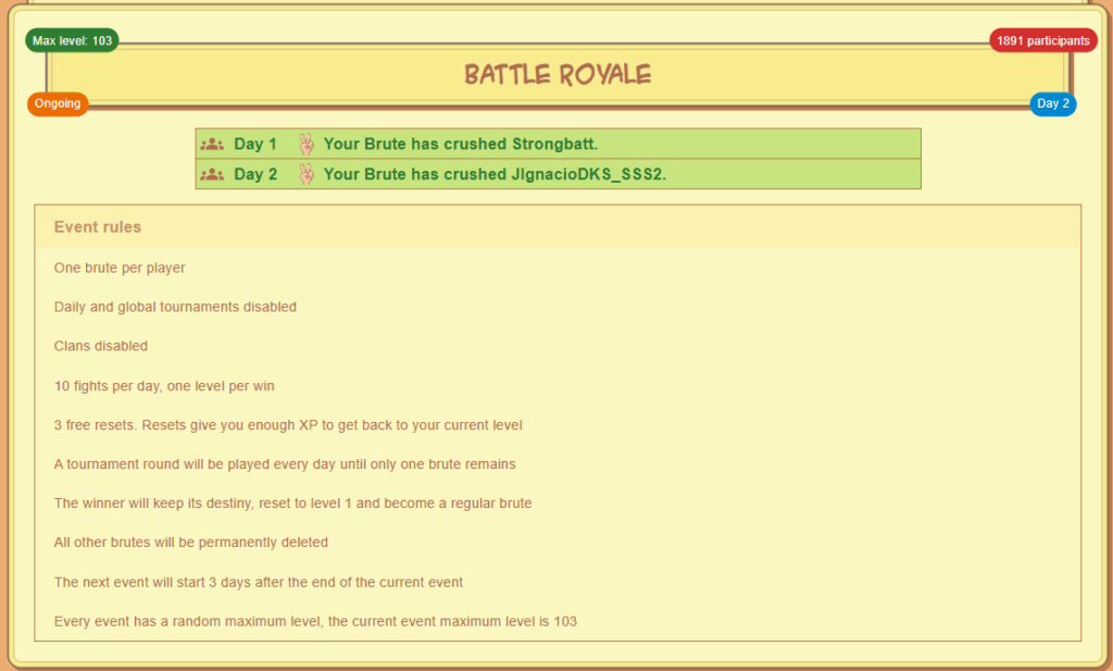 Well, if you have a character slot free, you can make a special brute for the Battle Royale. This one levels super fast, and you can change your destiny three times for free to make the perfect brute. The max level is random for each event (103 for the current one), and after a week to prep, they start pitting the brutes together. Last brute alive gets to be promoted to a regular brute, level 1, same destiny. Every other brute gets unceremoniously deleted.