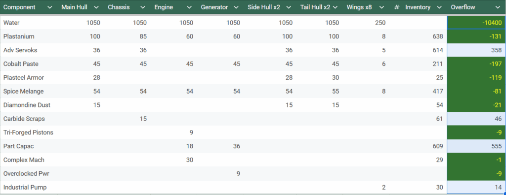 The components with a green background are the ones we were short. We’d need to collect all of these.