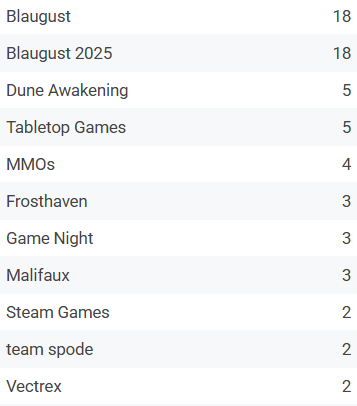 The categories for this month’s posts track my interests. Five posts about Dune: Awakening (there could have been many more). Three each for Malifaux and Frosthaven; none for HeroQuest because, apparently, we didn’t play HeroQuest this month. We played Terraforming Mars in the most recent game night. Two posts about the Vectrex! And I’m glad for those; Blaugust gave me a reason to get the Vectrex out and play some of the games I’ve been collecting. While writing the most recent post, I found that the Vectrex is getting the “mini” treatment! So there was even news I might have missed were I not writing a post.