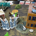 Bashe’s terrifying aura and Snow Storm’s ice pillar empowerment made it difficult for the enemy to make any real headway against my tanks; they also apparently didn’t realize they could destroy my ice pillars, and so my models remained powered up the entire game. With a combination of killing models and attacks that moved enemies, I was able to inch ahead in control points and made the strategy and the extra point on the scheme, putting me ahead 4-3.