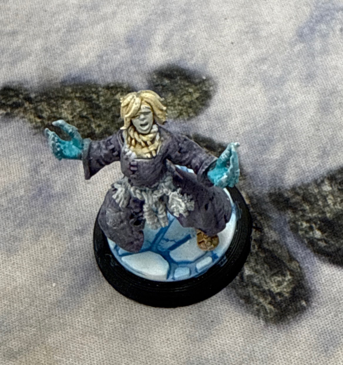 One model I’m still waiting on is Mara, the new totem for Rasputina, Abominable. We know from the art that she is a December cultist who wears a mask and has glowing blue talons for hands. Kasul found a model that looks somewhat similar. I painted it up and she joined my crew for last night’s game.