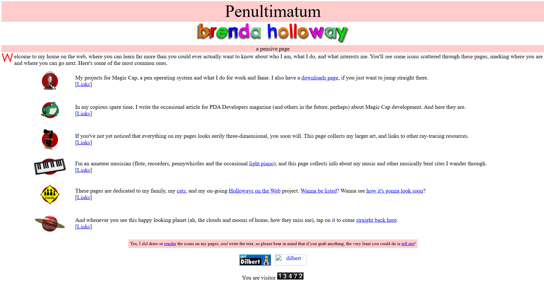 Penultimatum was my first or second blog (darfstellar being the other one, not sure in which order I made them). I believe I did most of the art myself; I think I stole the frog cartoon from somewhere. I know it was my one mission in my online life to get my blog indexed by Yahoo!. I’m not sure what I expected to happen if it did. Fame and fortune, probably. I had my head in the clouds a lot back then. But this was what you did, if you were web-capable back in the dawn of the public Internet — you made your own web page, you made your own blog, and then you tried to get people to read it. Since I was, at the time, minorly internet-known for the stuff I worked on at Apple and Sony, some people did, and I was happy.