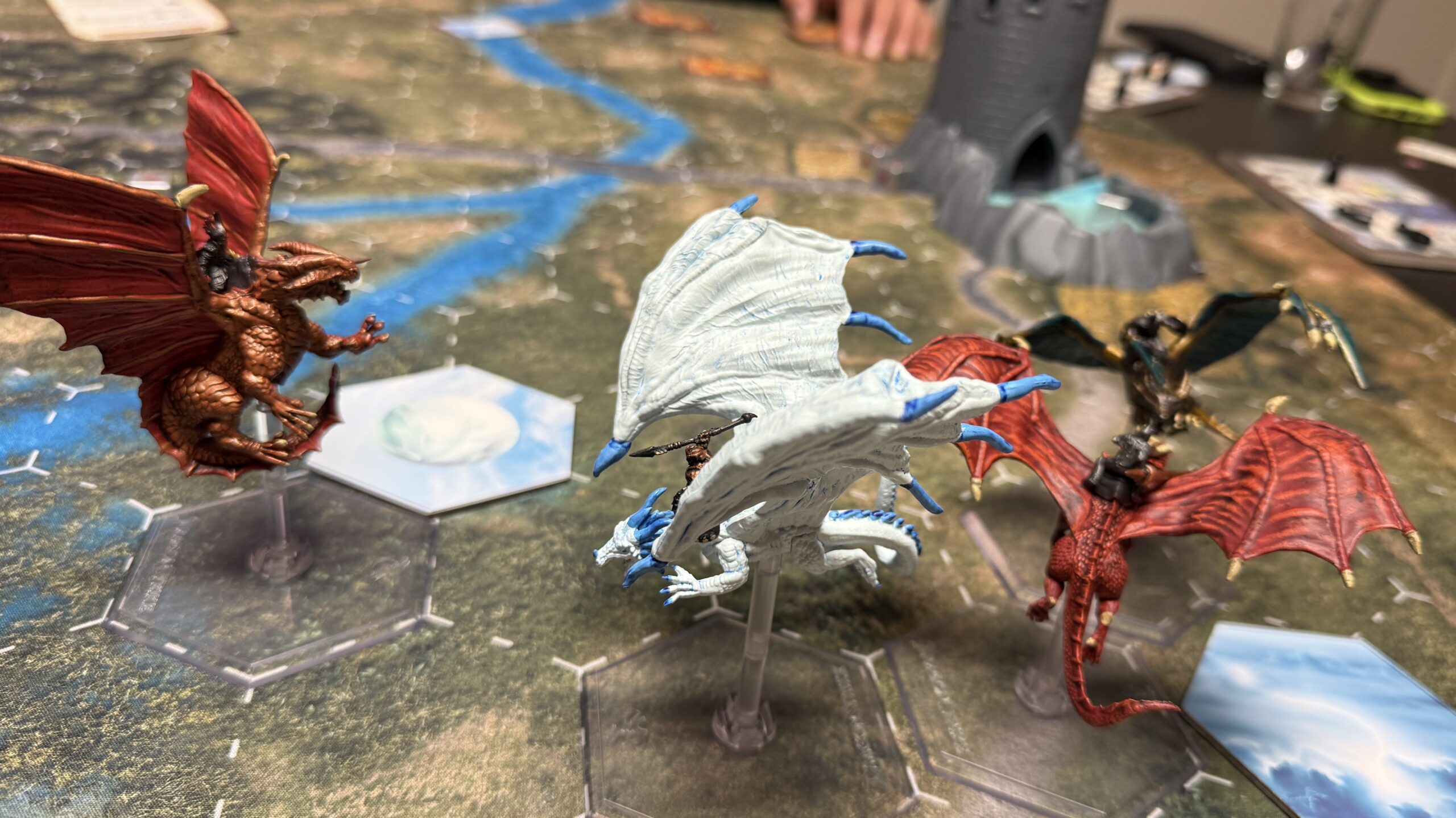 The version of the game I backed came with a thick neoprene play mat, four pre-painted dragons and riders (red, white, copper and bronze), four double thickness player board, four maneuver decks, pawns to track dragon condition and speed on the player boards, five silver “dragon dice”, map decorations and hazards, and a four minute timer.