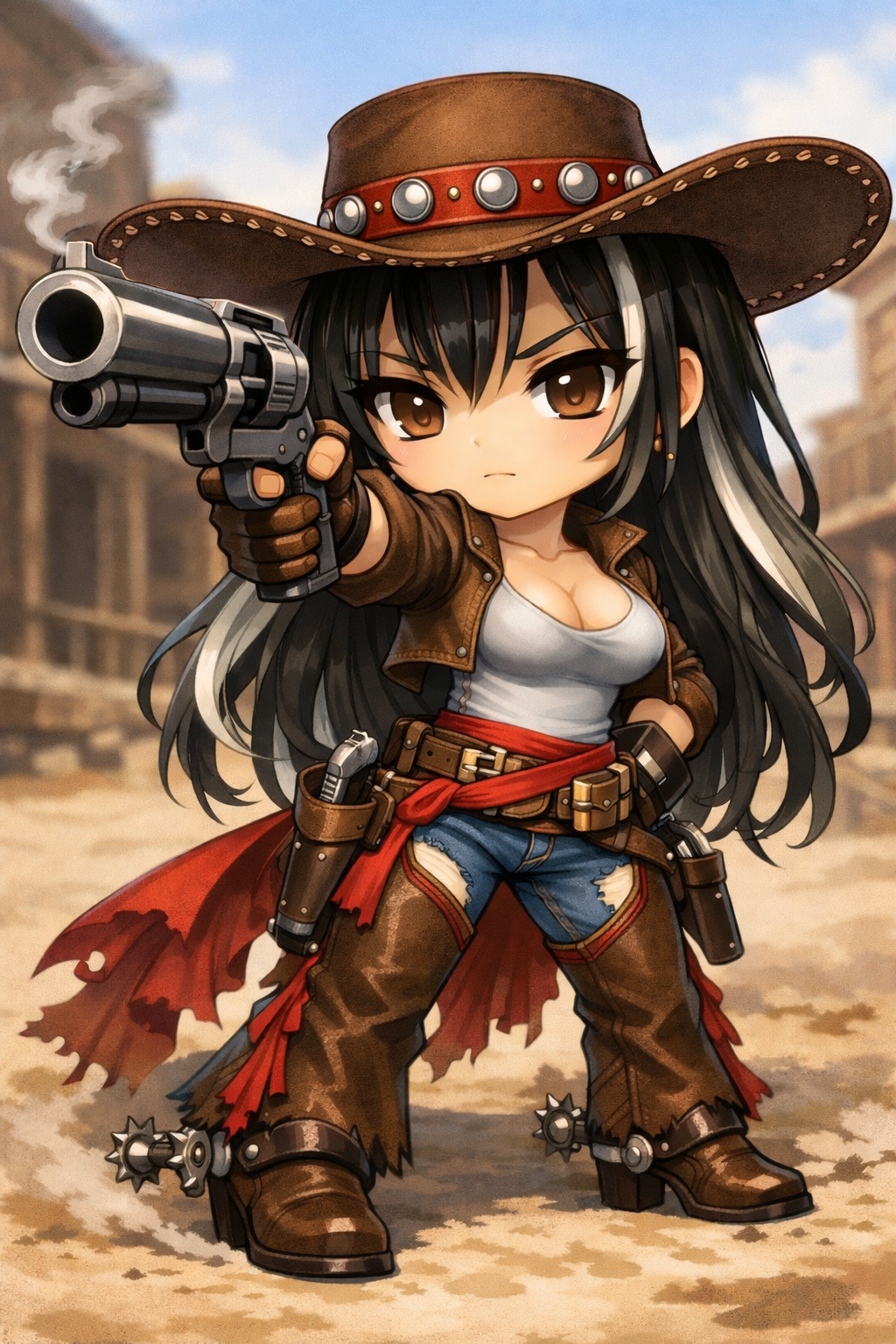 “Chibi anime-style young woman with long black hair with streaks of gray, wearing a very wide brimmed brown hat with a red hatband decorated with large silver studs, a tight low cut tank top, a brown leather bolero jacket, a long red sash around her waist, jeans with long, red-trimmed leather chaps, boots with spurs, two holsters, leather gloves, pointing a huge revolver, old west vibe. Expression: deadly calm and dangerous.”