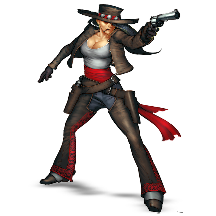 “That is very close; I added the official art for context. Make her shirt a light gray tank top, as in the art. We’re looking for a female sexy but old gunslinger vibe. This is for the Malifaux master Perdita Ortega.”
