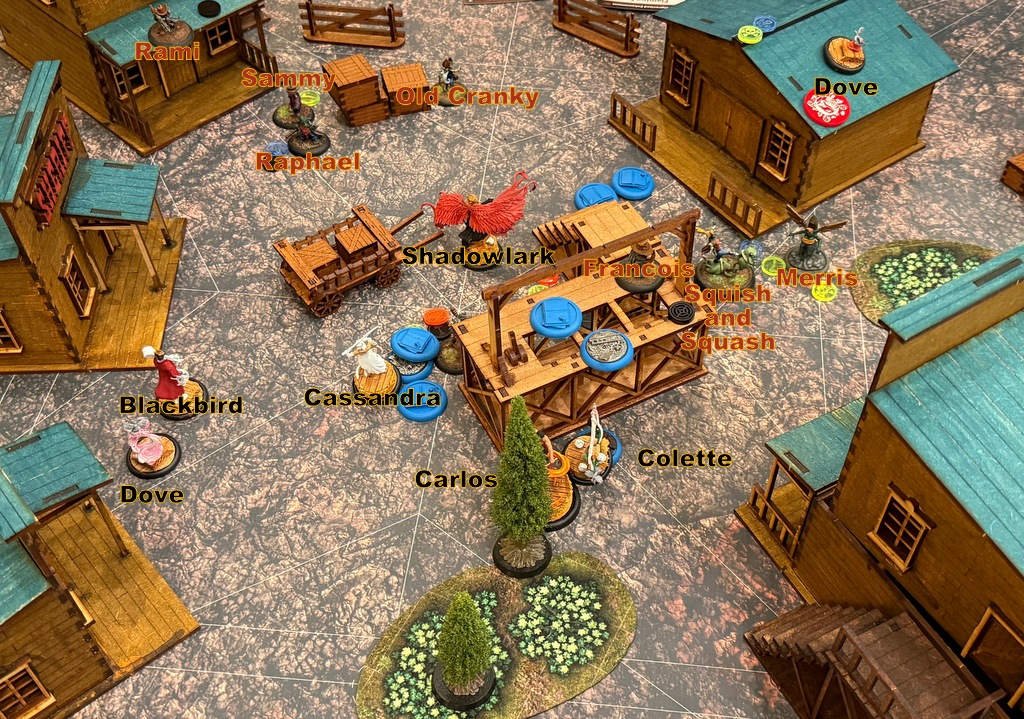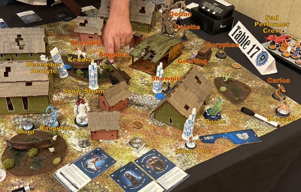 Deployment was Corner, and as attacker, I was able to choose which corner I wanted. The corner I wanted was the one that was largely clear, and where the opposite corner was blocked by a huge house. He cursed my name (in a good-natured way) the entire game. His plan was to use Dorian Crowe to toss the crew into the center of the board. He wasn’t able to do this because of how we deployed. You can see from the timer that this is quite late in the game, and Dorian is still back there by the deployment zone, along with his master, Colette. Two powerful units who couldn’t really contribute to the game purely because of the deployment.