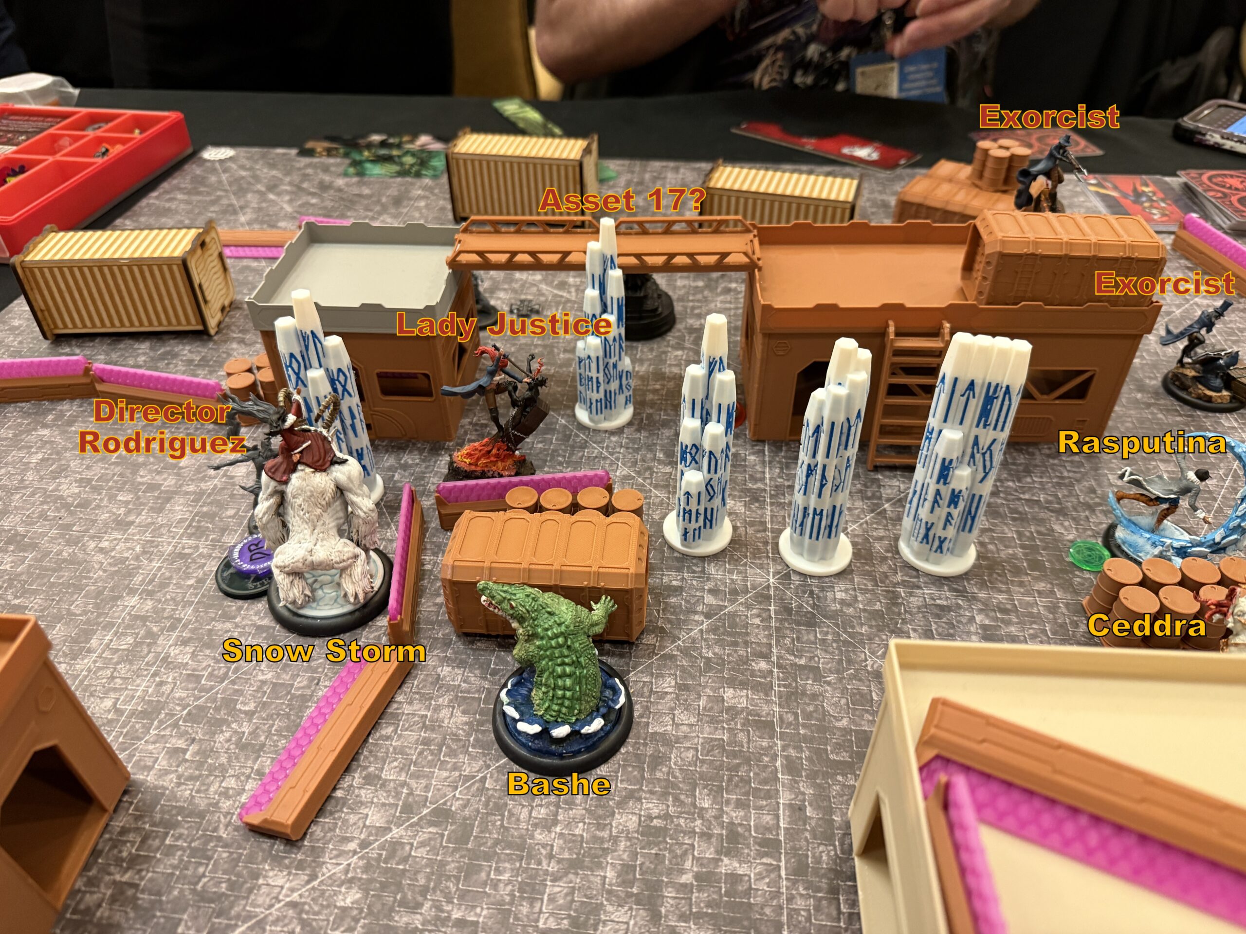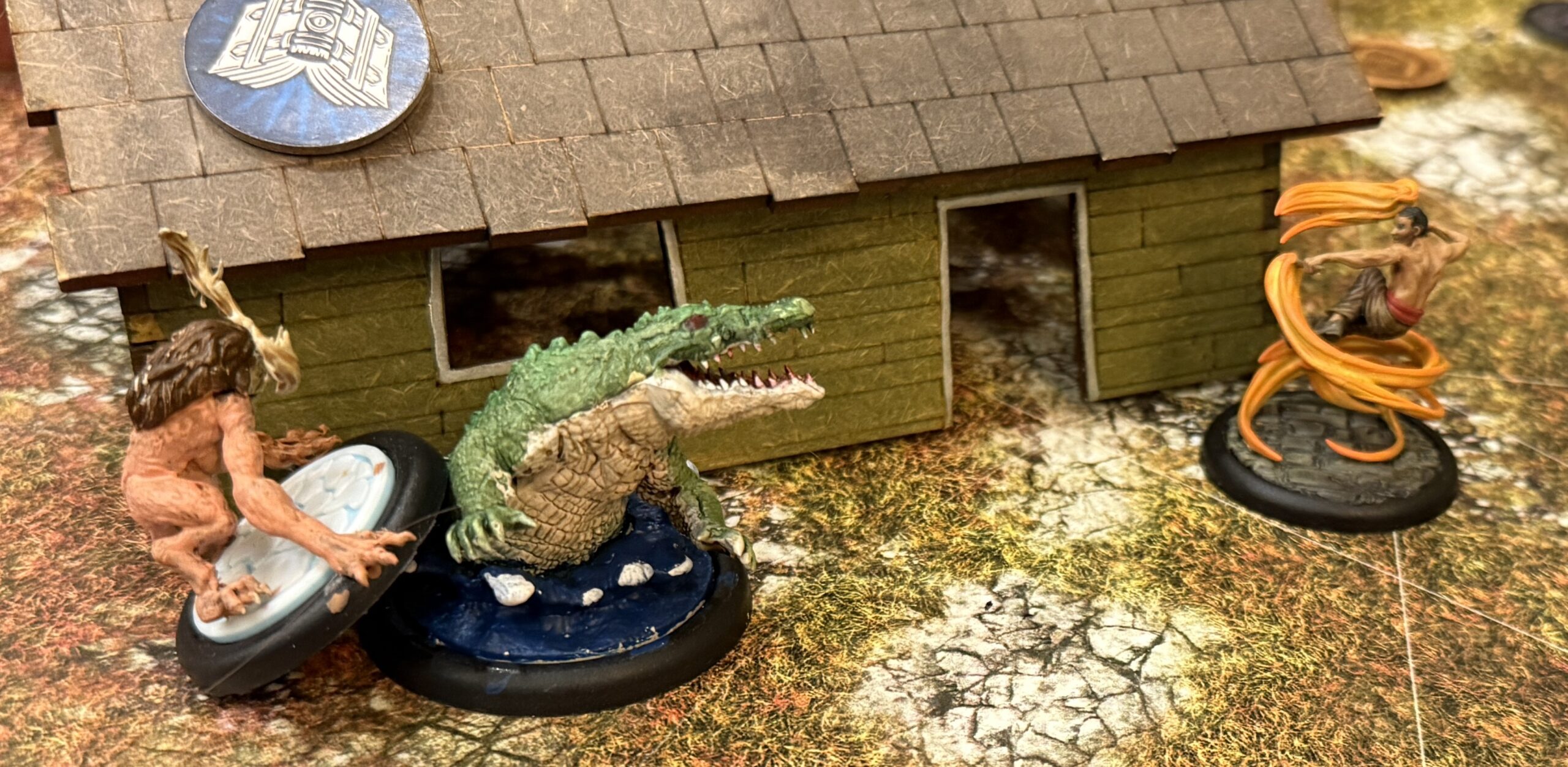 The version of Lady J I’ve faced before specialized in devastating direct damage. It seemed the Death-Touched variant drops corpse markers and then pulses conditions from those corpses. This was good, in a way, with Bashe on the team, as he eats corpses. He’s a giant alligator. It is what he does. But, the same ice pillars that kept Lady J pent up made it difficult for Snow Storm and Bashe to get good licks on her, so I had to bring Raspy up on the side to take her on directly. Having Raspy within 6″ of an enemy model in base contact with an ice pillar makes that model unable to move or be moved without explicitly using a “Walk” action.