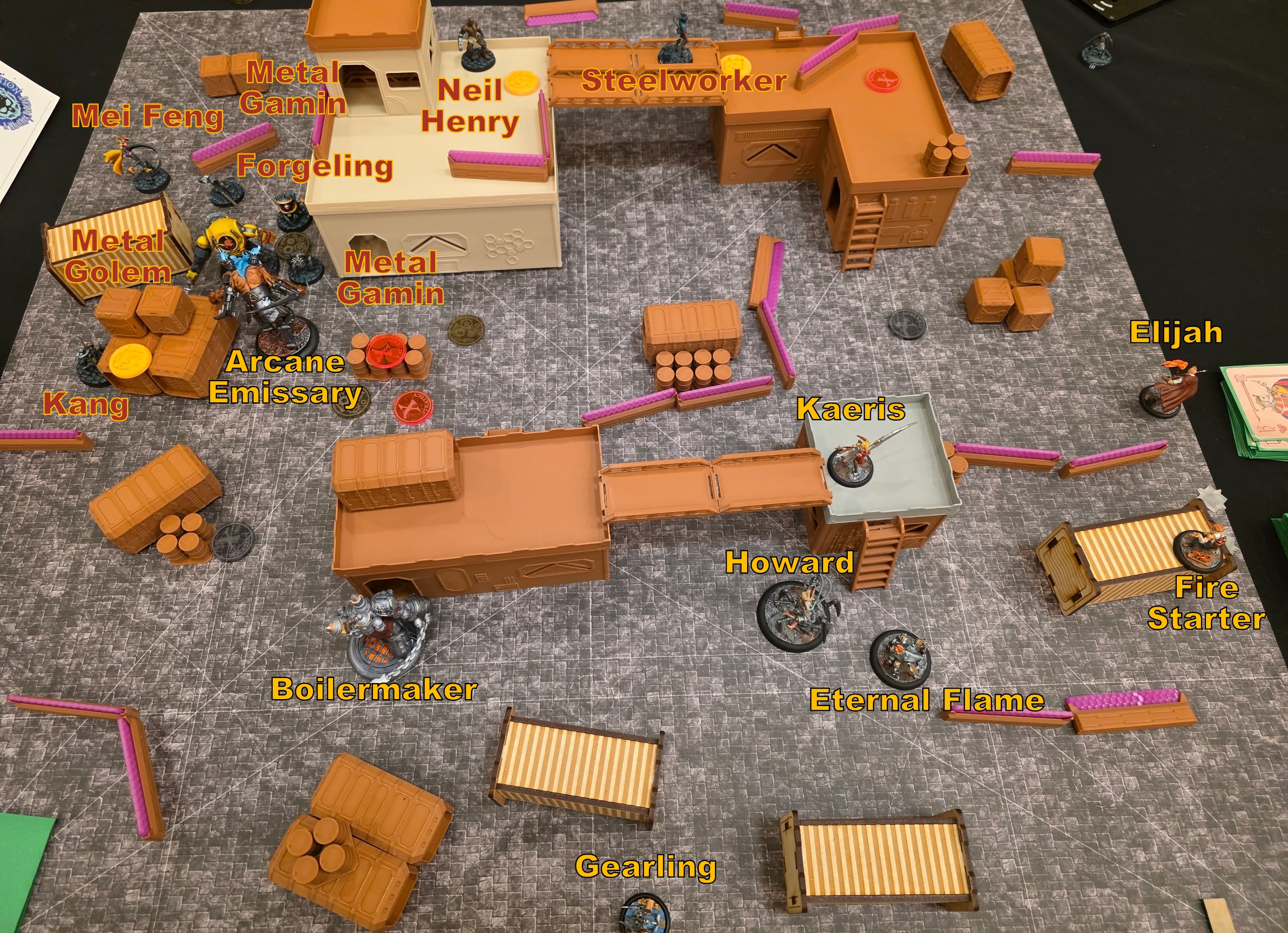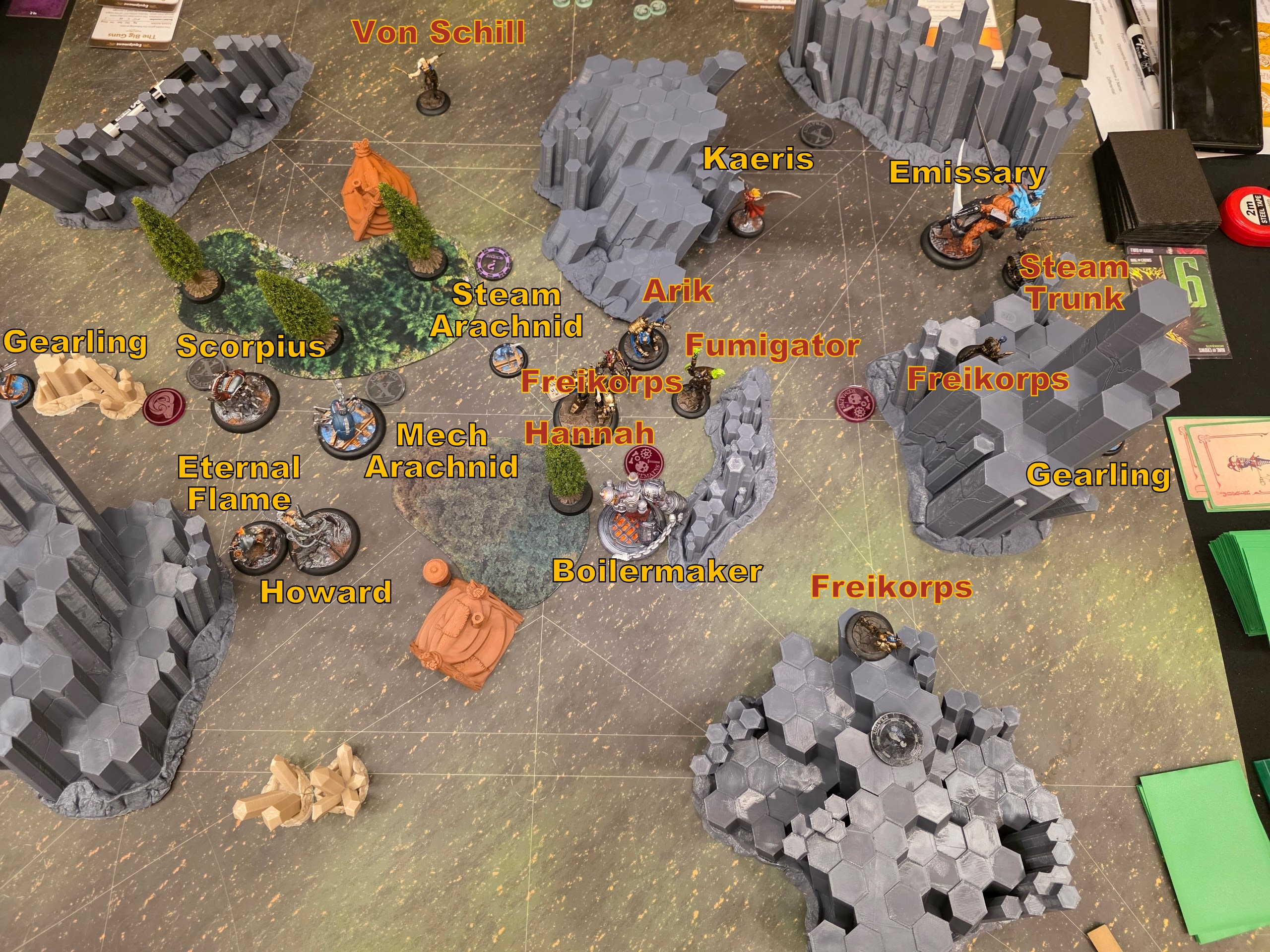 This was Kasul’s second round table. Foundry was my old favorite team in third edition, but it’s hard to play them now since they stopped being part of the Arcanist faction. I could, and I have, but when you enter a tournament, you have to declare a faction, and for me, it’s always going to be Arcanist, so I simply cannot play them in a tournament. Against friends it’s fine, but even then, I’d rather preparing my tournament teams.