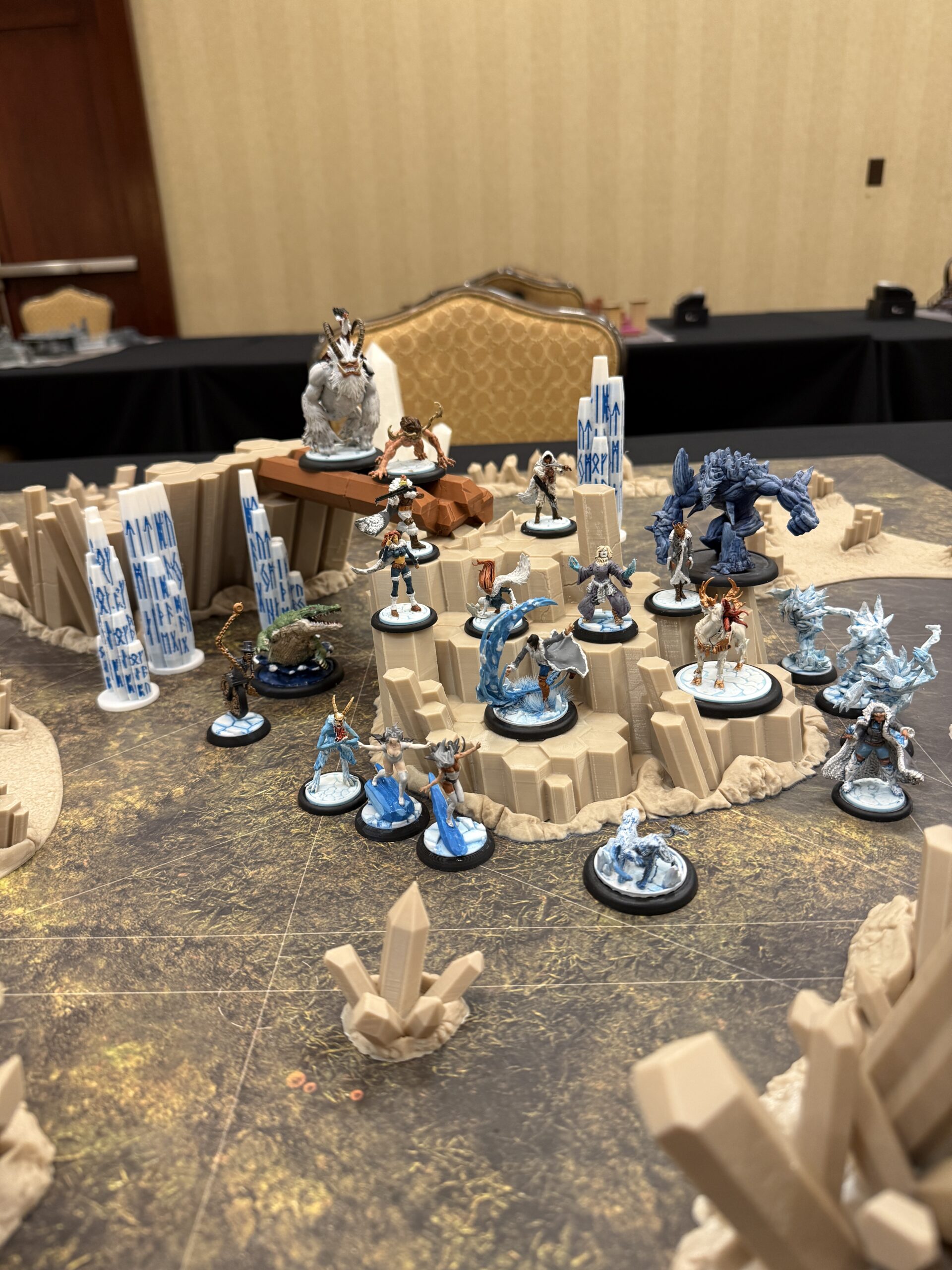 There were three matches on Friday. We had the deployments, strategies and schemes for all the matches for the entire weekend ahead of time. The first two Friday matches were deployed with Flank and Corner, two deployments that didn’t really work well with my slower moving December team, so I thought I would try out the team I am currently painting (slowly), Performer on the first two, and save December for the third. Standard deployment, with Reshape the Land in the scheme pool allowing me to get an easy two points by just making the ice pillars I’d make anyway.
