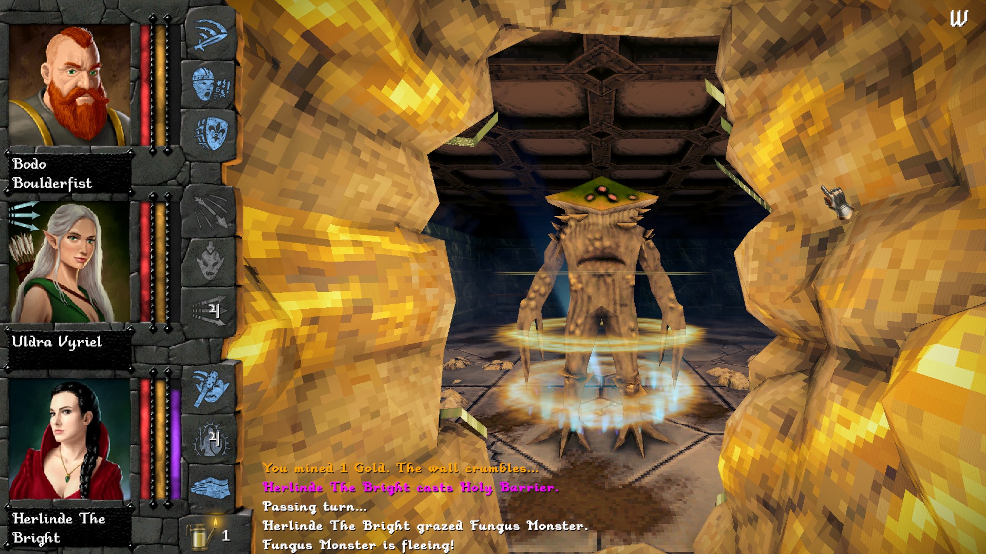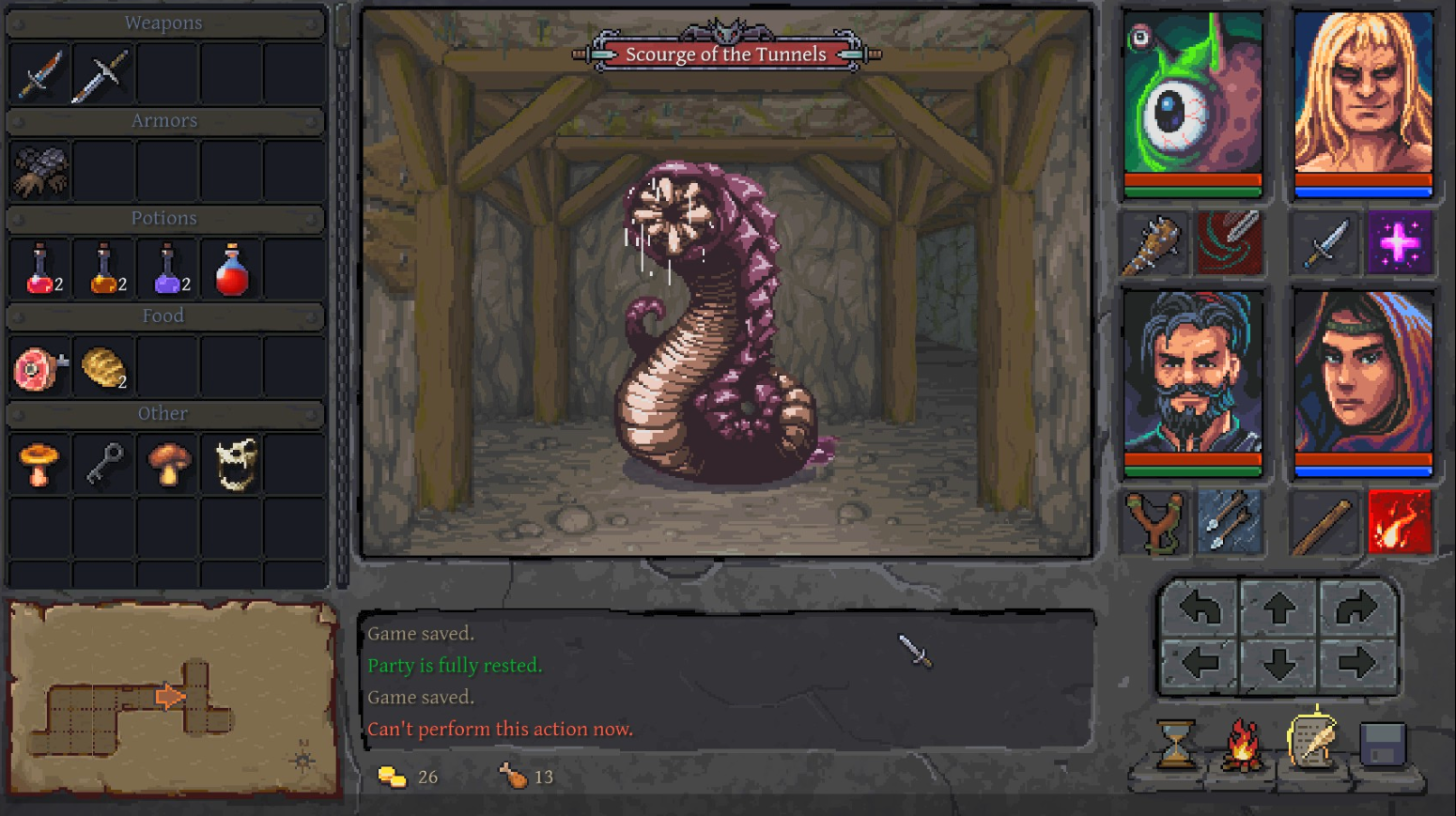 Underkeep gives you four adventurers over Dverghold‘s three, but they are somewhat less capable, each having a “free” attack and an attack that uses stamina (for physical attacks) or mana (for magical attacks). Monsters and quest rewards are plentiful enough that all my characters leveled in the dungeon, which allowed me to make the current attacks more powerful, choose new ones, or unlock passive buffs and auras. Many monsters drop food, which you will consume when you rest, and resting is simple and easy and can be done right in the dungeon.
