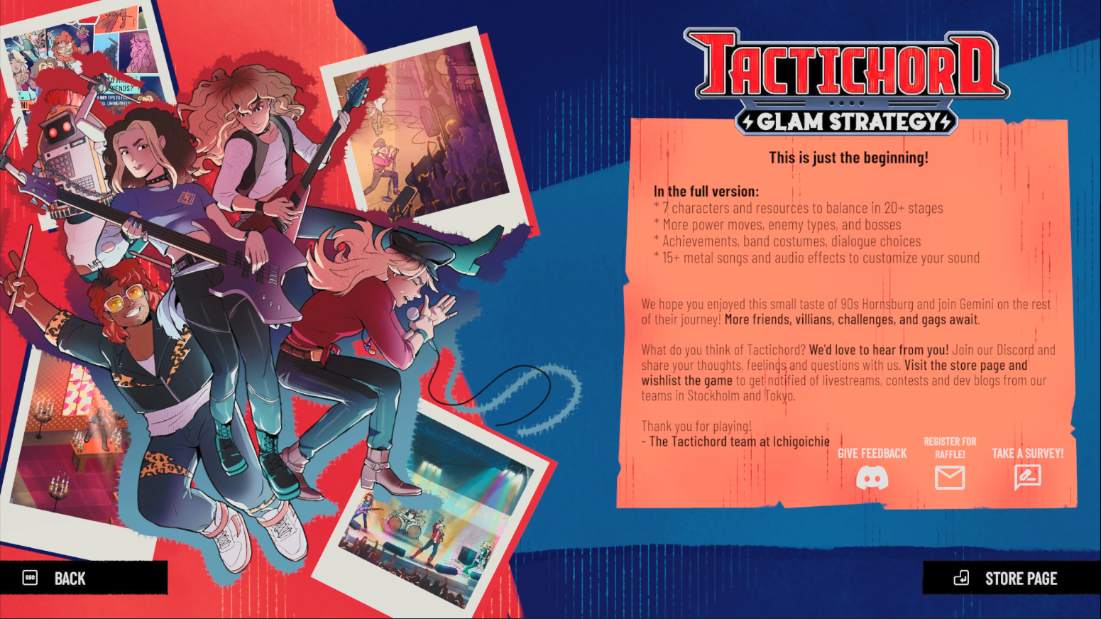 As for difficulty: The demo is not difficult, although it is just the beginning of the game. The tempo is: the game gives you a new ability, you use that new ability in the coming battle, and so on. By the end of the demo, everyone has at least one special ability, the singer has two. The survey you take when you finish the game suggests various keywords that might appear on the Steam page, and “puzzle” is one of them, so it might continue that you keep gaining bandmates/abilities throughout the game.