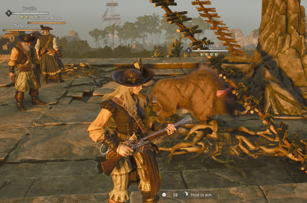 Have I not told you the tale of Truffles the Pig? There is a mysterious temple hidden in the Footlands; it requires an offering. A blood offering, as if there was any other kind. Three tokens hidden in nearby pirate camps, and all the bloody meat you can carry. If your offering is accepted, you’re given a special whistle that can summon Truffles, a boar with a lot of poise, if not much health. Truffles wants to tank for you. You should let him.